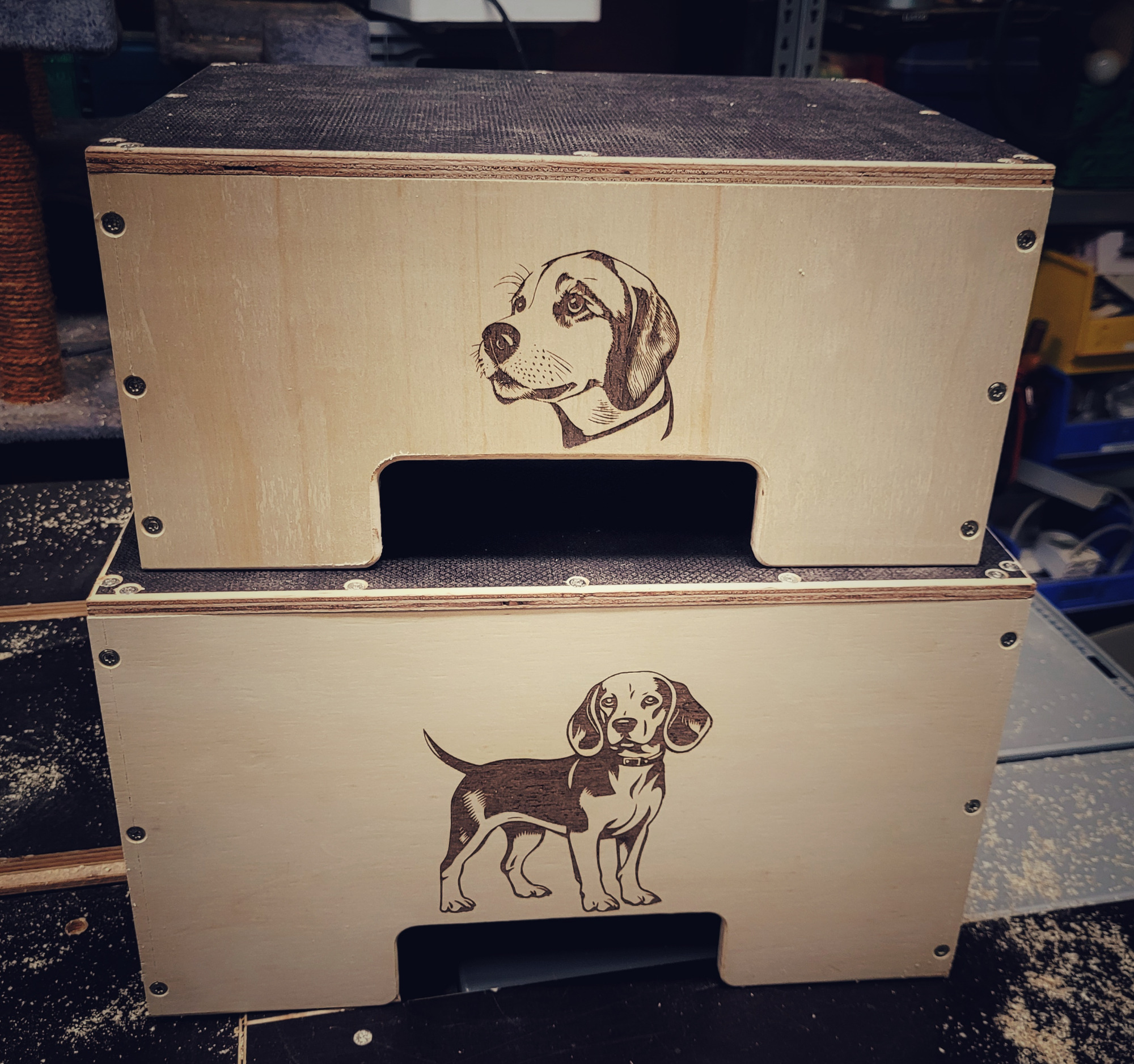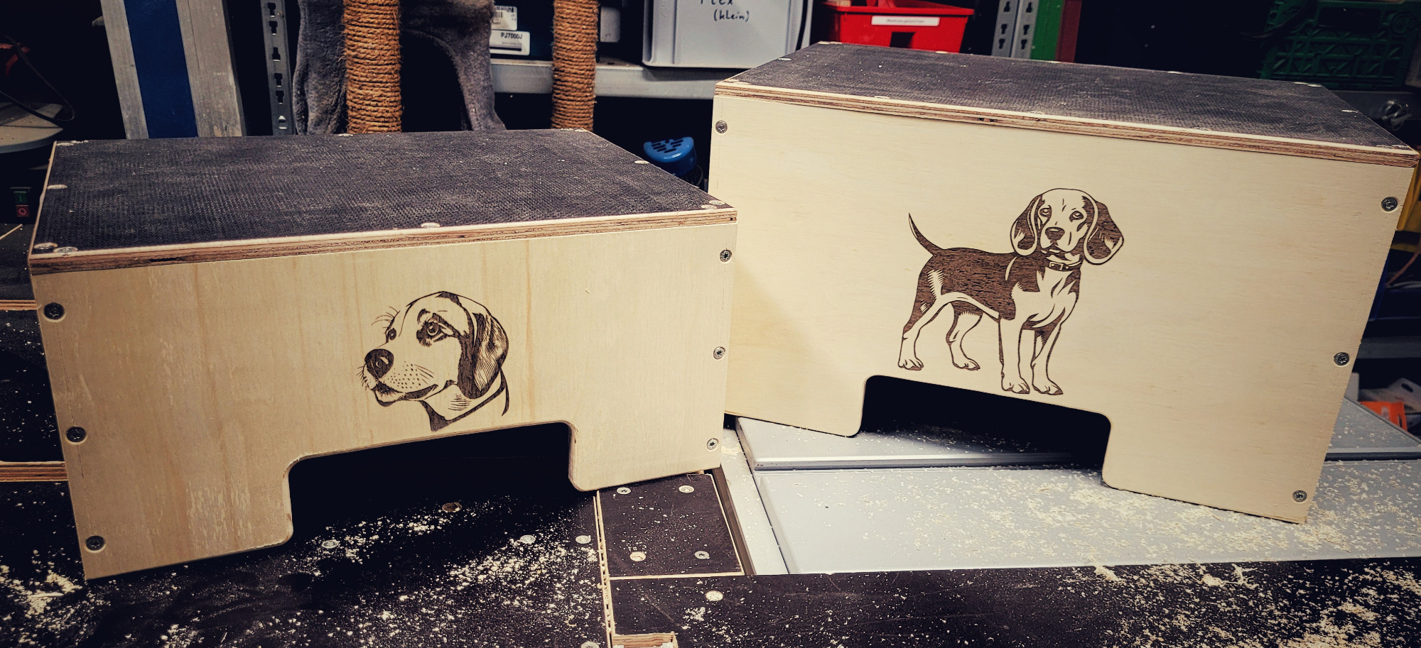 Der Kundenwunsch stand am Anfang.... Podeste in bestimmten Maßen, um mit dem Hund angemessen trainieren zu können... Höhe, Breite und Tiefe sind auf den Hund abgestimmt... Auch die Gravur war Kundenwunsch...