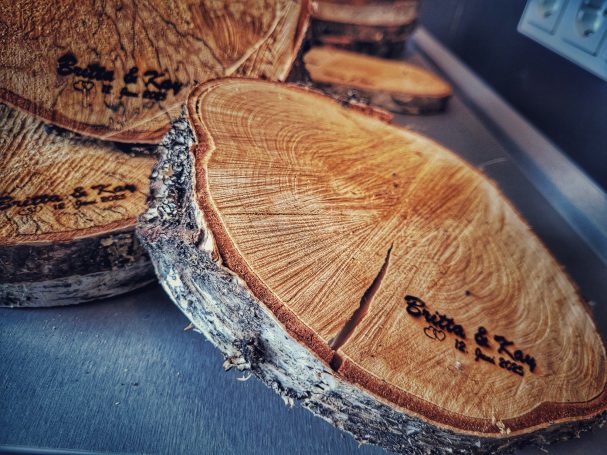 Personalisierte Baumscheiben als Tischdeko