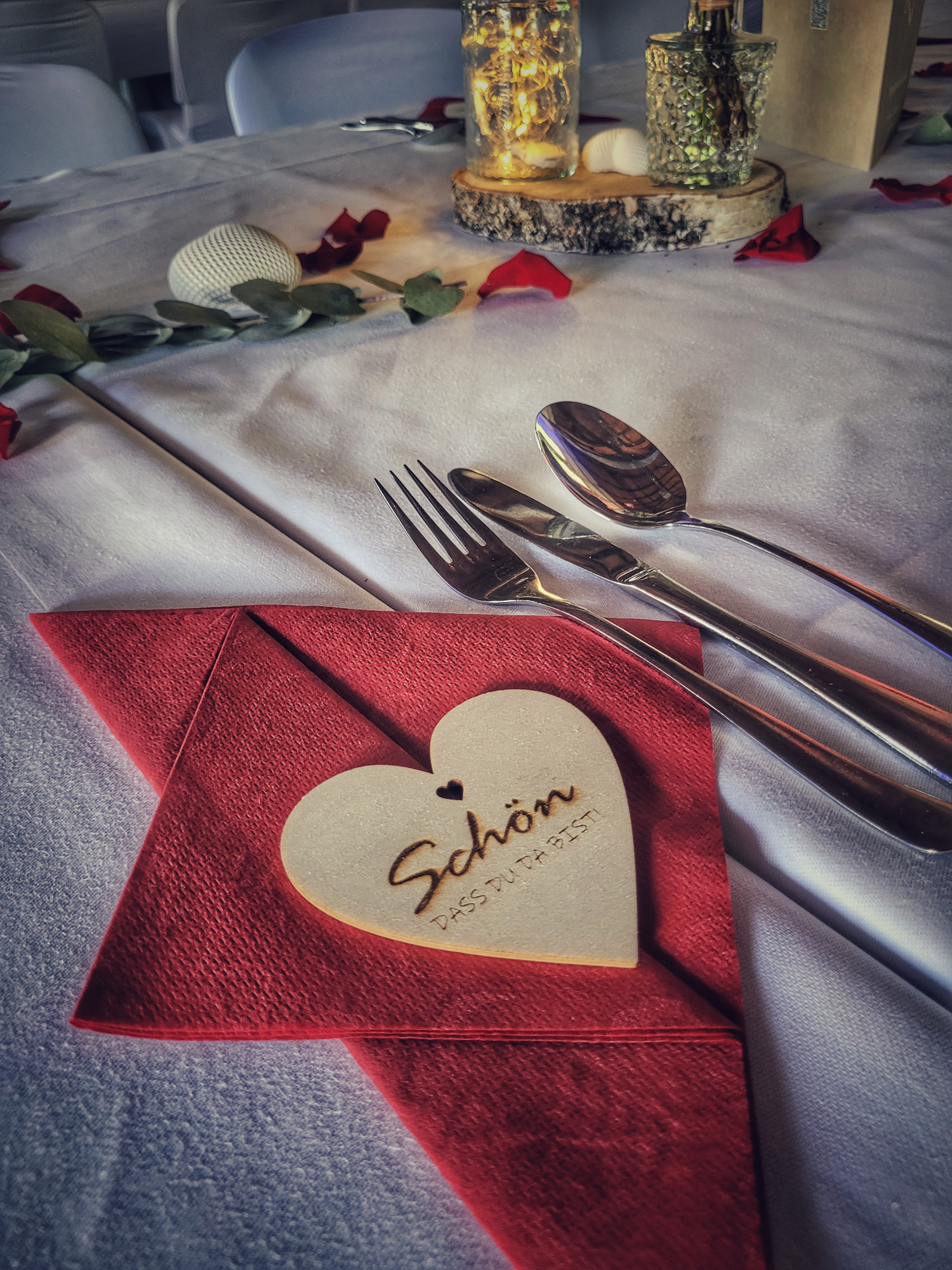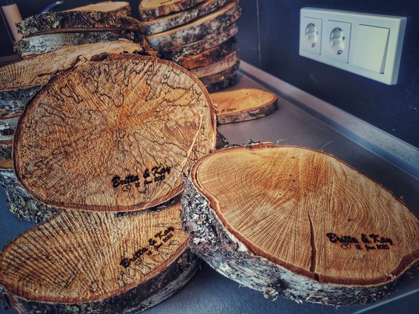 Diese Baumscheiben sind für die Tischdeko der Hochzeitsfeier von Freunden entstanden...